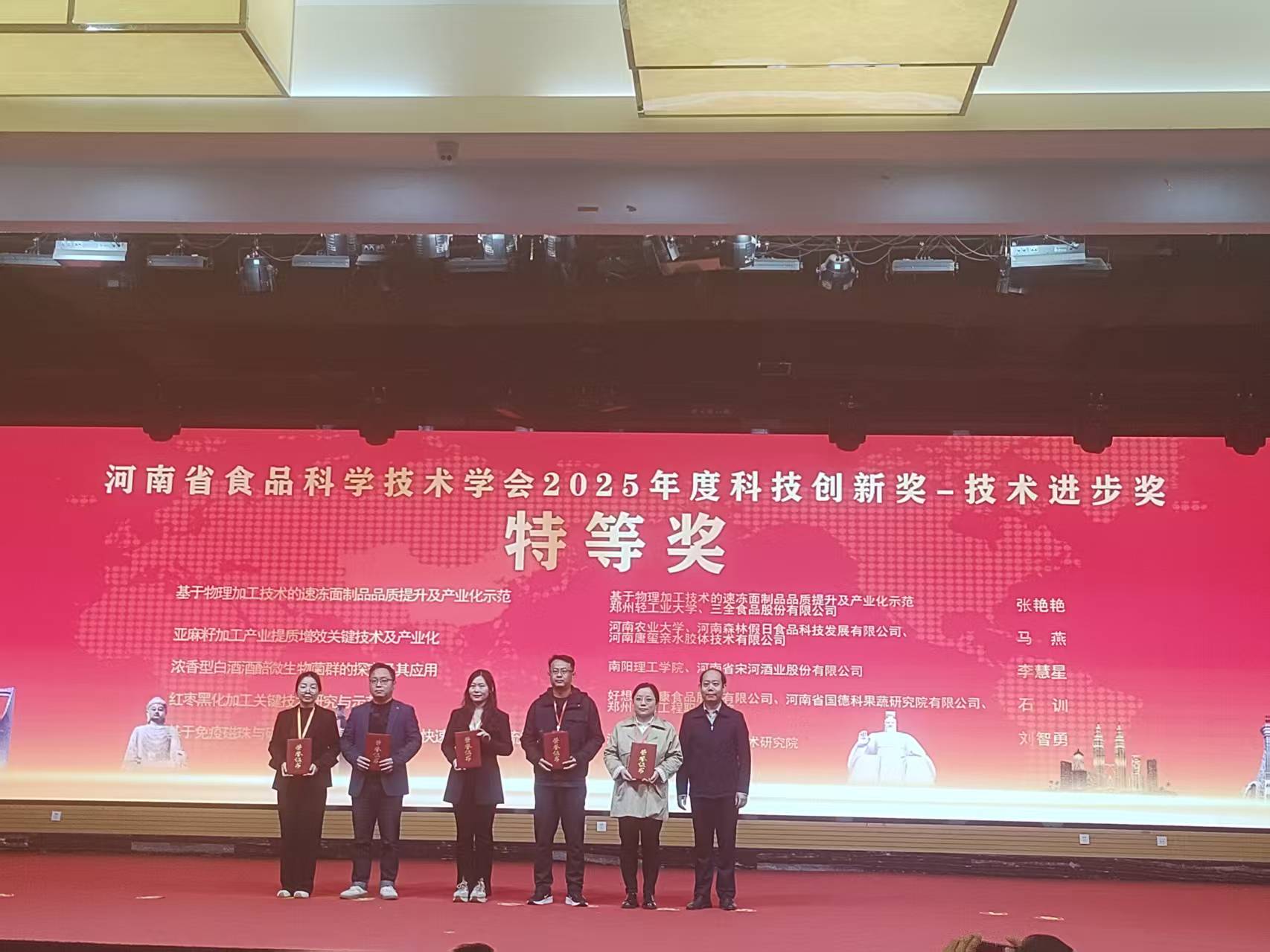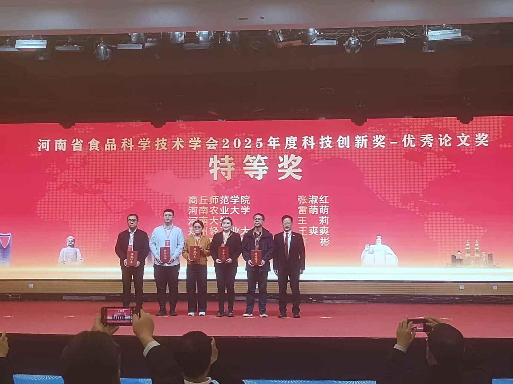 在同期举办的河南省食品科学技术学会年度表彰活动中,张艳艳荣获“科技创新奖——技术进步特等奖”,王宏伟荣获“科技创新奖——技术进步一等奖”,王爽爽荣获“优秀论文特等奖”,充分展现了实验室在食品科学科研创新与成果转化方面的实力。此次参会进一步加强了实验室与行业组织和企业的交流合作,为推进食品产业人才培养、科研协同与技术赋能提供了新机遇,也为推动行业高质量发展贡献“轻工力量”。