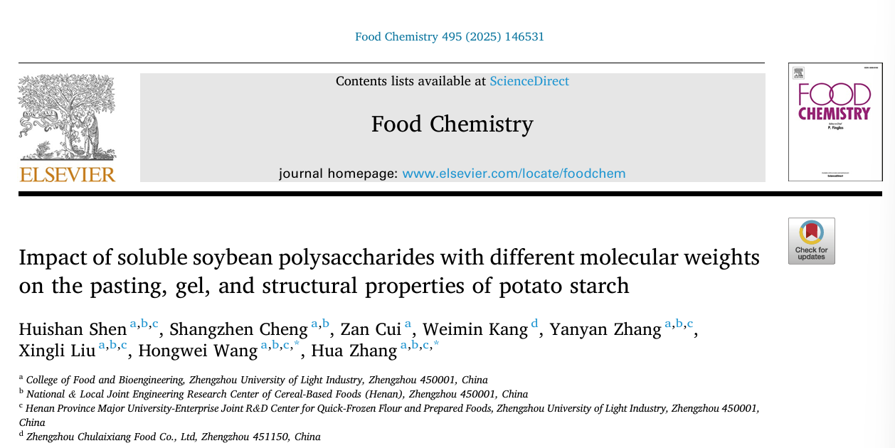 冷链食品加工与安全控制教育部重点实验室(培育)张华教授课题组在《Food Chemistry》(中科院一区,IF=9.8)发表了题为“Impact of soluble soybean polysaccharides with different molecular weights on the pasting, gel, and structural properties of potato starch”的研究成果。