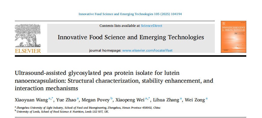 王小媛副教授在《Innovative Food Science & Emerging Technologies》发表题为“Ultrasound-assisted glycosylated pea protein isolate for lutein nanoencapsulation: Structural characterization, stability enhancement, and interaction mechanisms”研究成果