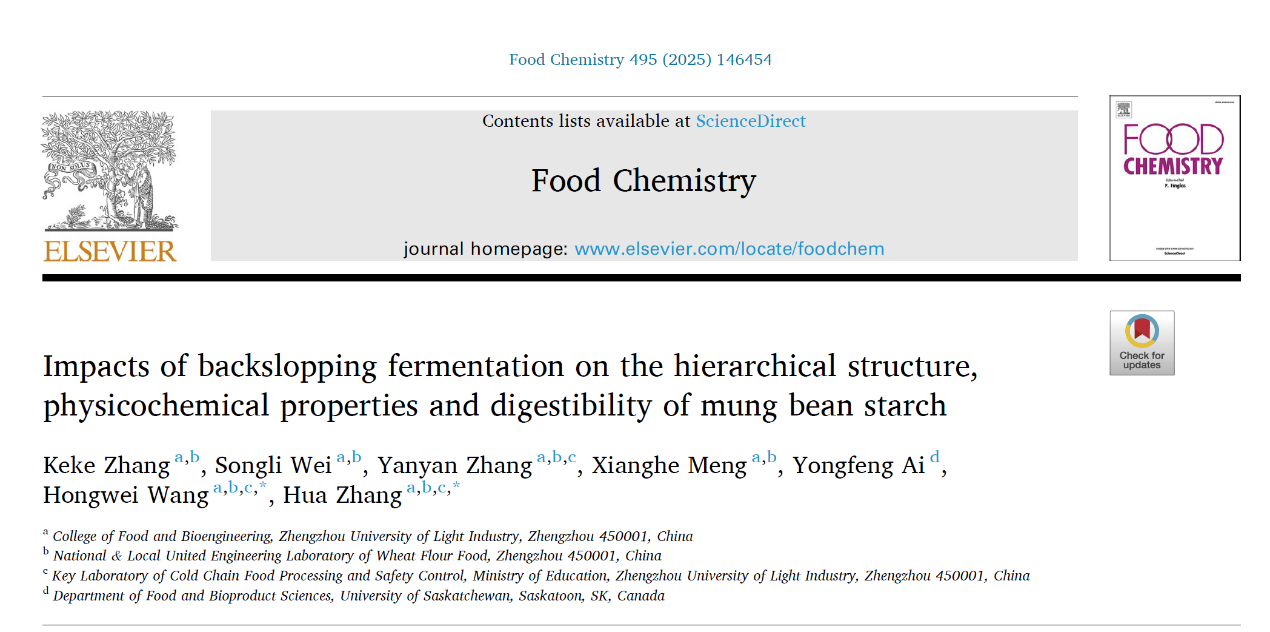 近日,冷链食品加工与安全控制教育部重点实验室张华课题组在《Food Chemistry》(中科院一区,IF = 9.8)发表了题为“Impacts of backslopping fermentation on the hierarchical structure, physicochemical properties and digestibility of mung bean starch”的研究论文。第一作者为2023级博士研究生张可可。